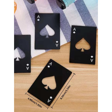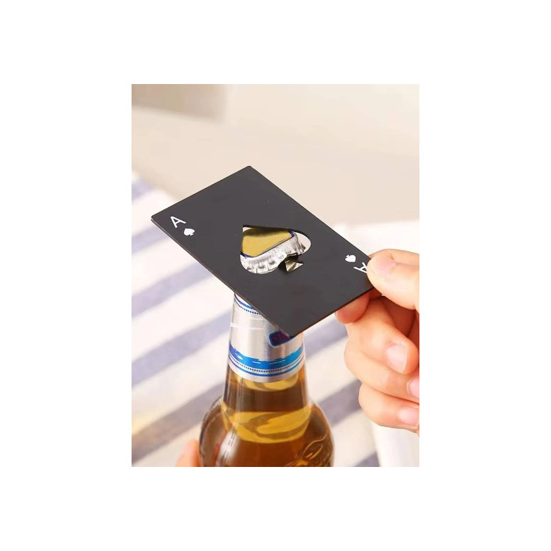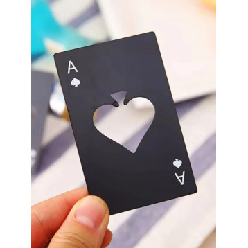 Deschizător de sticle în formă de carte de credit din oțel inoxidabil, stil poker As de Pică. Compact, durabil, perfect pentru orice ocazie.