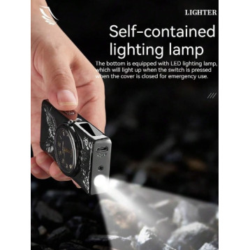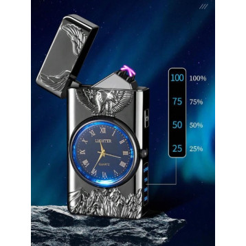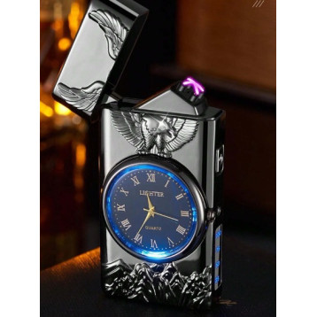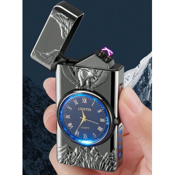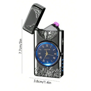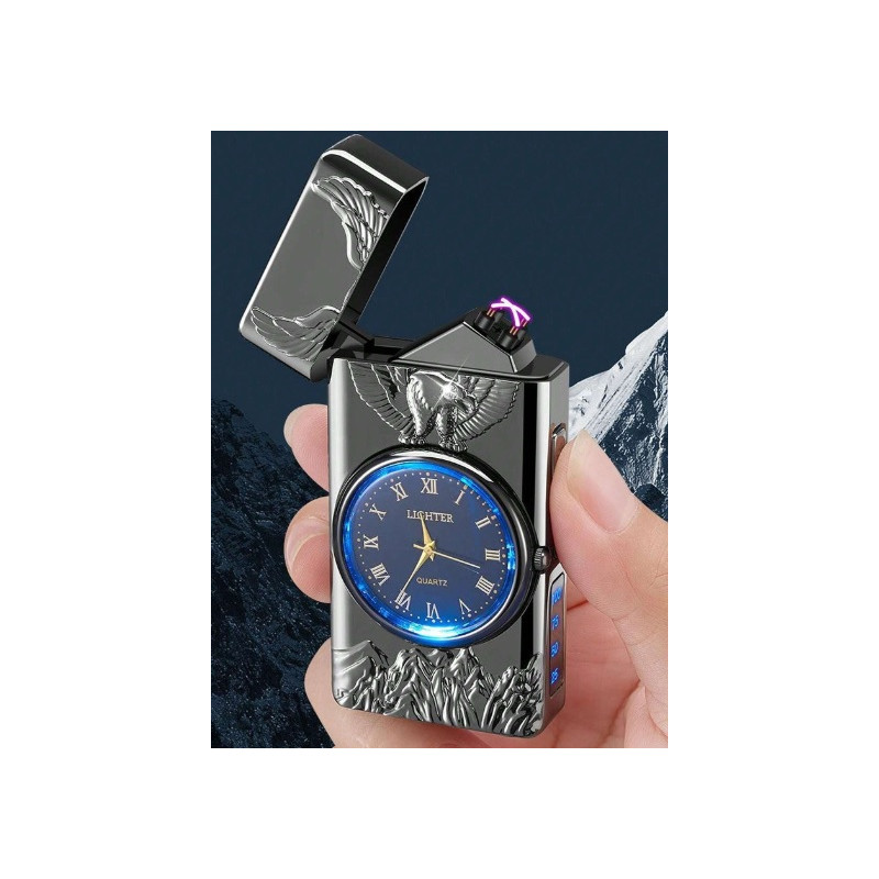 Ceas reîncărcabil cu brichetă electrică și design vultur în relief. Afișaj digital, arc dual, LED și funcție de brichetă.
