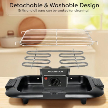 Grătar electric fără fum pentru interior, 2000W, cu temperatură constantă de 200°C, design detașabil, grătar de dimensiuni mari, ideal pentru bucătărie.