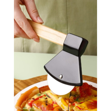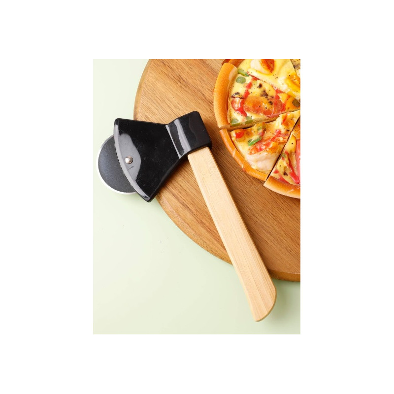 Cutter pentru pizza în formă de topor, cu lamă din oțel inoxidabil și mâner din lemn de bambus. Design unic și funcțional pentru iubitorii de pizza!